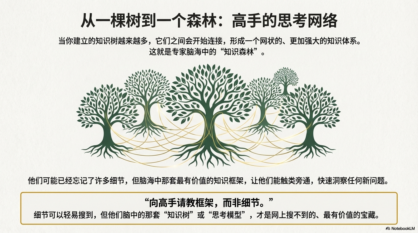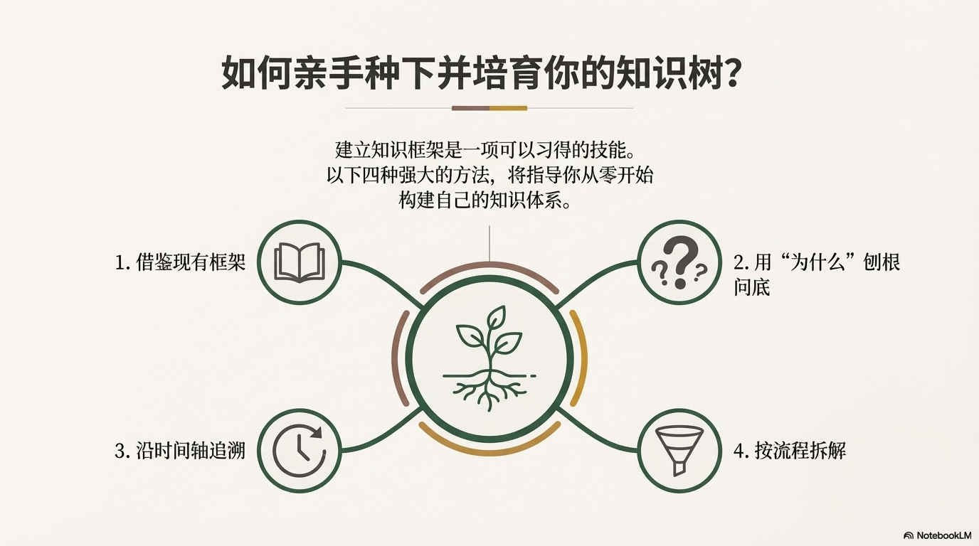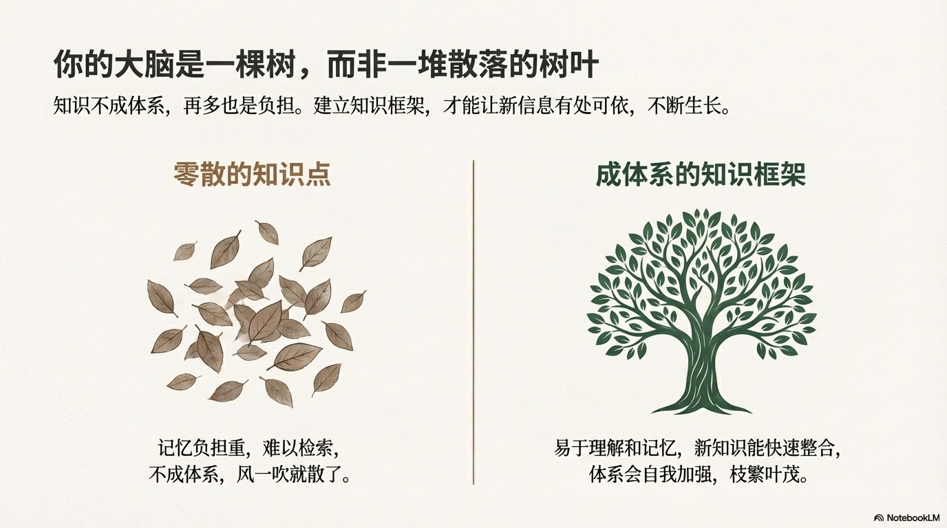 建立知识框架,将零散信息类比为易散落的叶子,而体系则是支撑它们的树干。