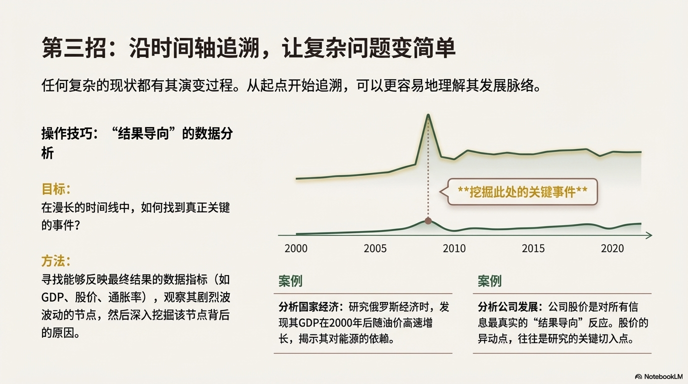 为了构建这种脉络,建议采用追问为什么、梳理时间线以及结果导向分析等具体策略,从底层逻辑理解事物本质。